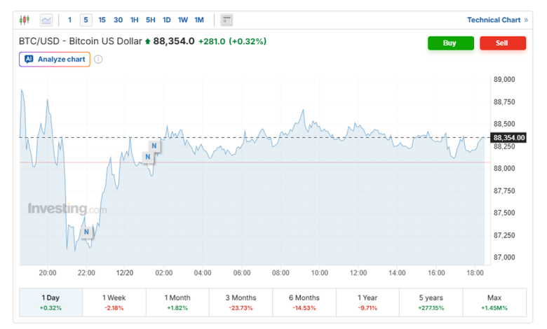 قیمت بیتکوین که در ابتدای روز با نرخ 88 هزار و 385 دلار در معامله بود؛ در ابتدا تا نرخ 88 هزار و 695 دلار بالا رفت.