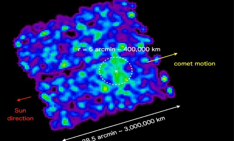 عکس XRISM را میتوان با عکس ماموریت «ایکسامام-نیوتون»(XMM-Newton) آژانس فضایی اروپا مقایسه کرد که آن هم تابش پراکنده پرتو ایکس را در اطراف دنبالهدار نشان داده بود.